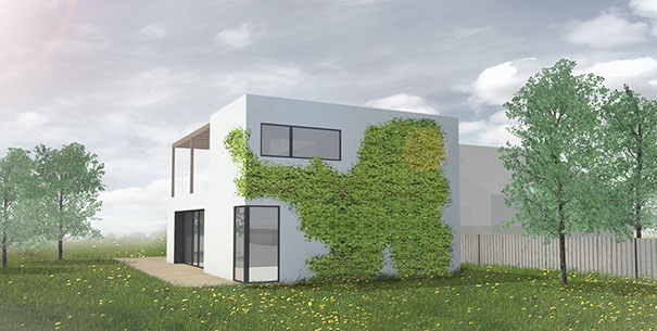 Na místě bývalé zahrádkářské kolonie u Říčan dnes vzniká sídliště rodinných domů. Tento rodinný dům bylo potřeba umístit na velmi úzkou parcelu. Vznikl proto účelný, vzhledově minimalistický dům ve tvaru kvádru se zapuštěnou terasou v patře a předsunutým vchodem v přízemí.