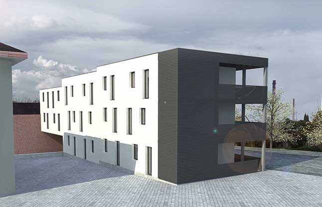 Studie ubytovny obsahující částečně jednopokojové byty s vlastním sociálním zařízením a částečně pokoje se společným zařízením. Jedná se o jeden stávající objekt a novou přístavbu, která je řešena jako pavlačový dům. Parcela se nachází v okrajové průmyslové části města.