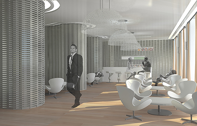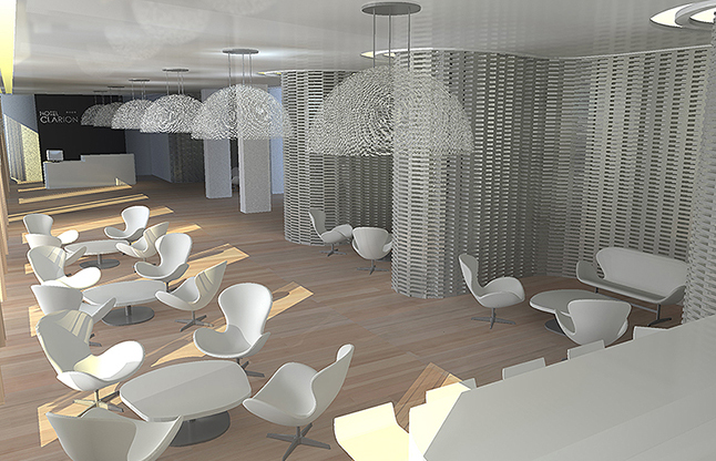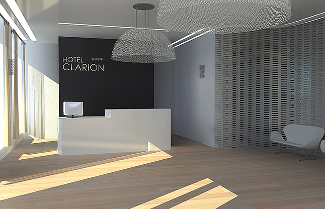 Studie interiéru hotelu Clarion řeší stávající prostory v původním objektu. Přední místnost směrem od ulice tvoří hotelová hala, která je propojena s lobby barem.V zadní místnosti, přirozeně osvětlené střešními světlíky, vznikla hotelová restaurace.