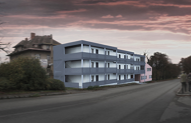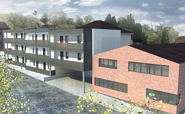 Studie ubytovny obsahující částečně jednopokojové byty s vlastním sociálním zařízením a částečně pokoje se společným zařízením. Jedná se o jeden stávající objekt a novou přístavbu, která je řešena jako pavlačový dům. Parcela se nachází v okrajové průmyslové části města.